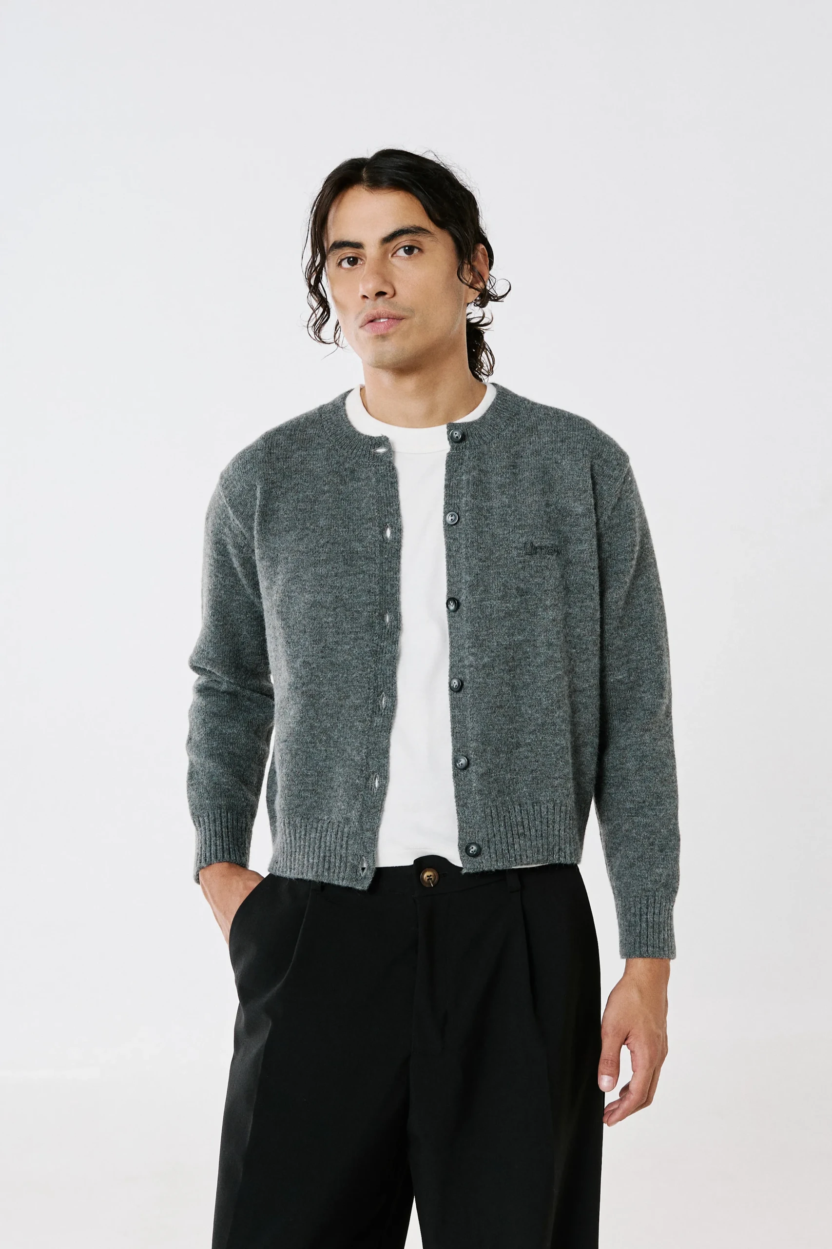Cardigan tejido con botones negros en cartera. Escote redondo, puño tejido elastizado en puños y cintura. Calce regular, largo a la primer cadera. Logo bordado a tono en pecho.