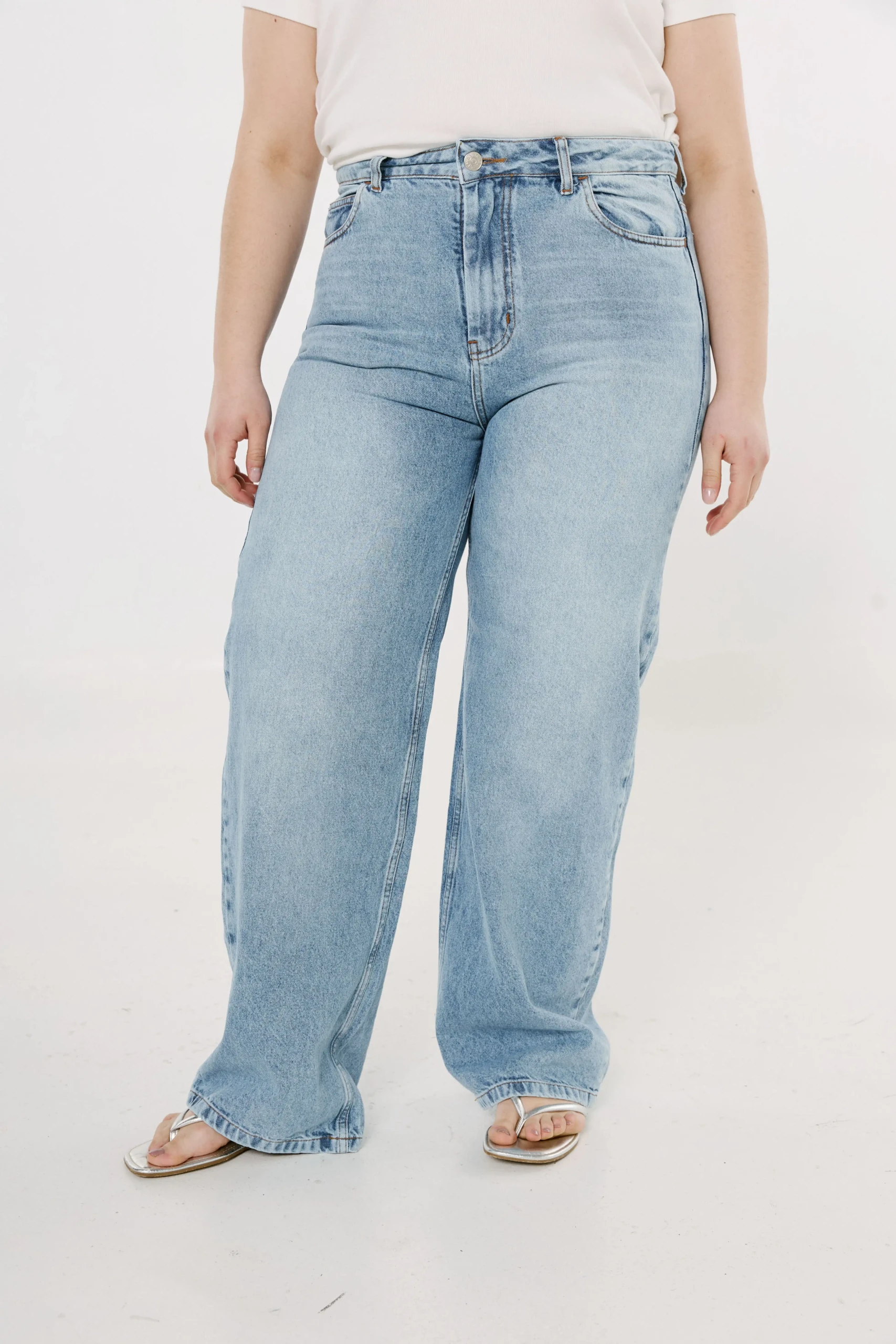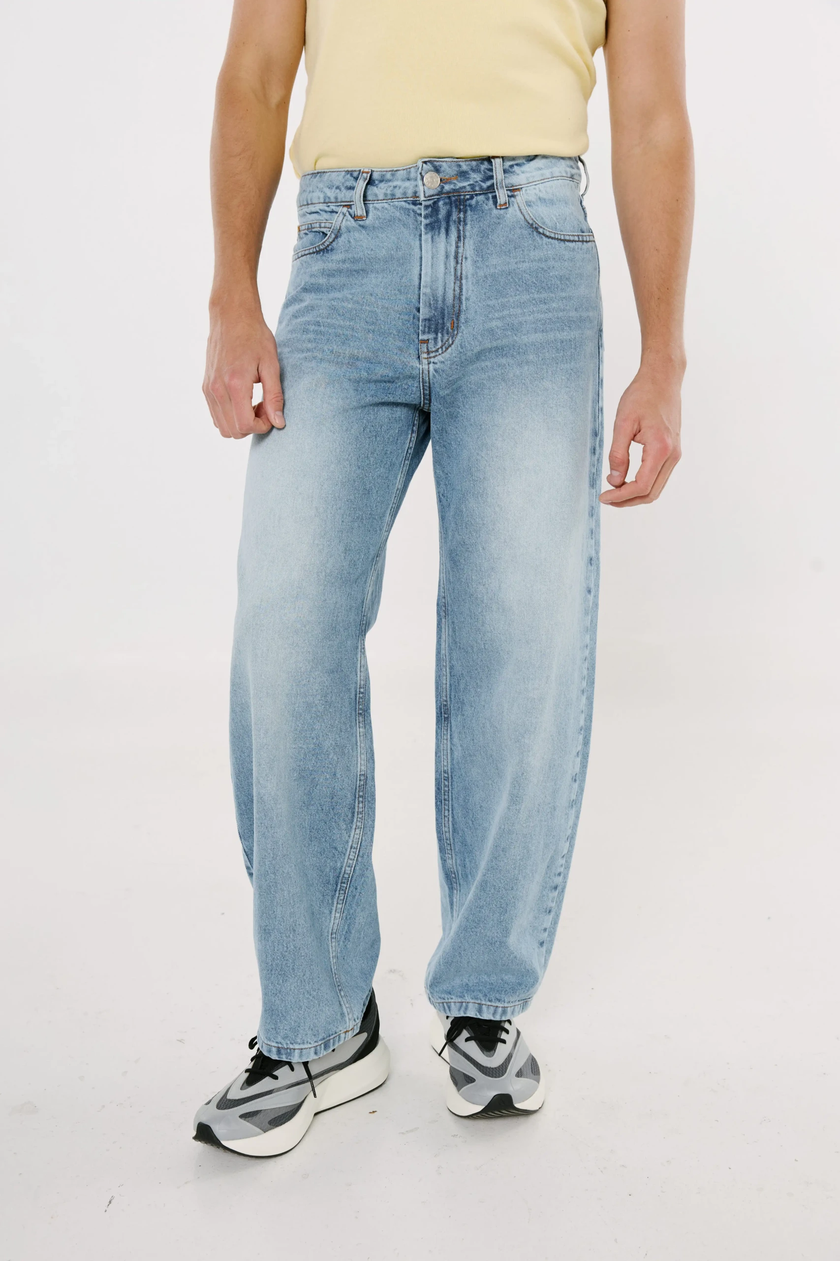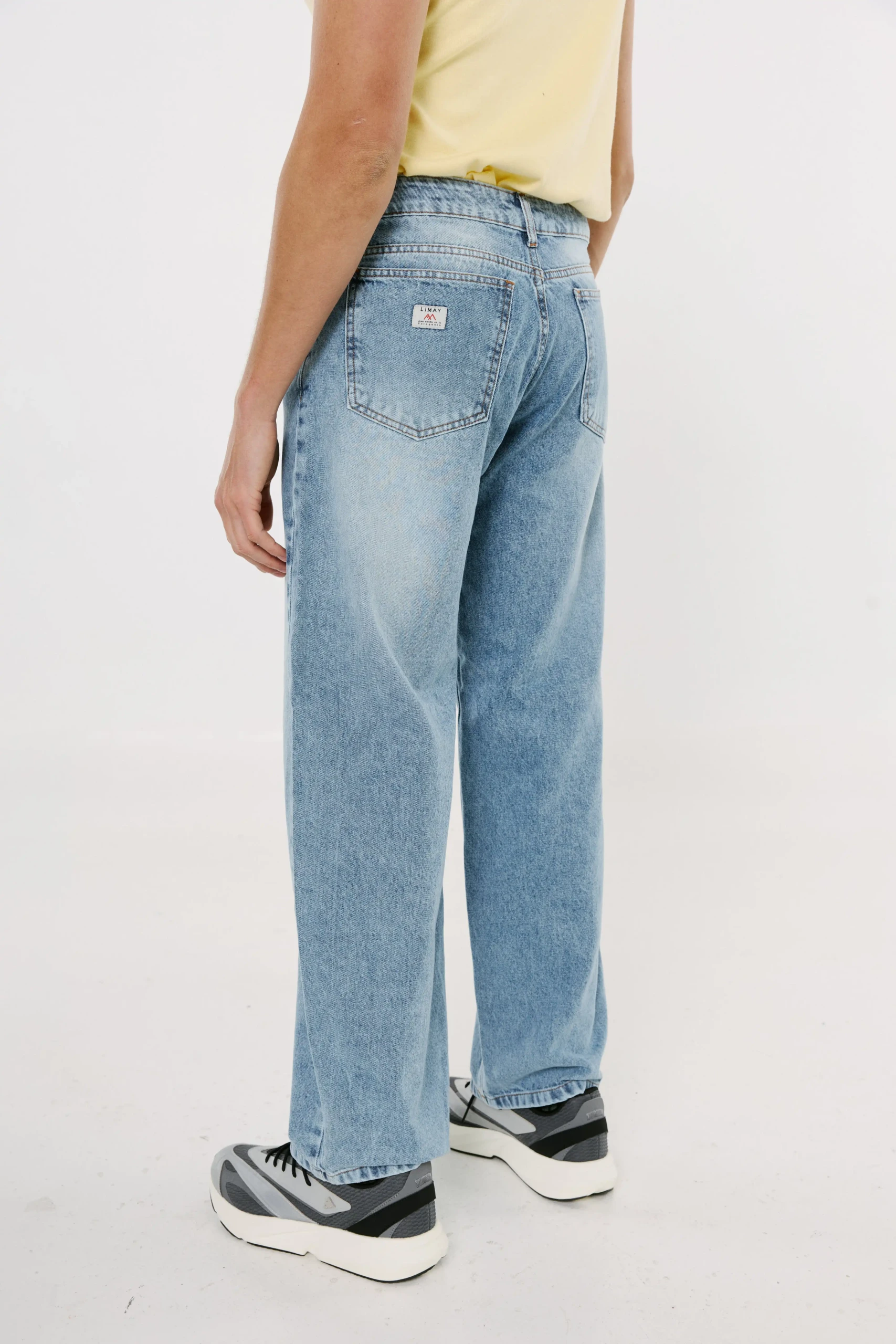 Jean confeccionado en denim azul 100% algodon con costuras cobre, con desgastado localizado y bigotes.