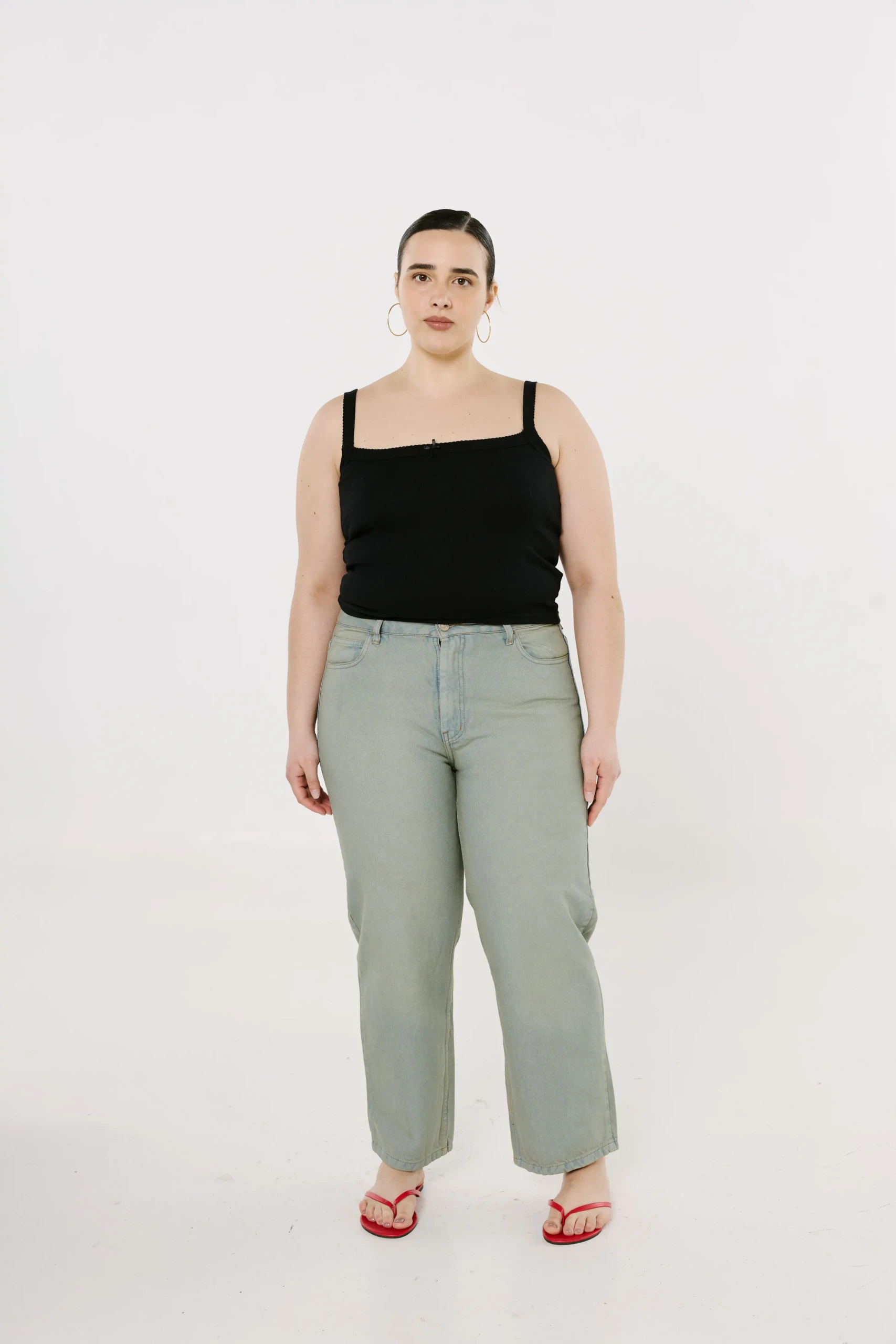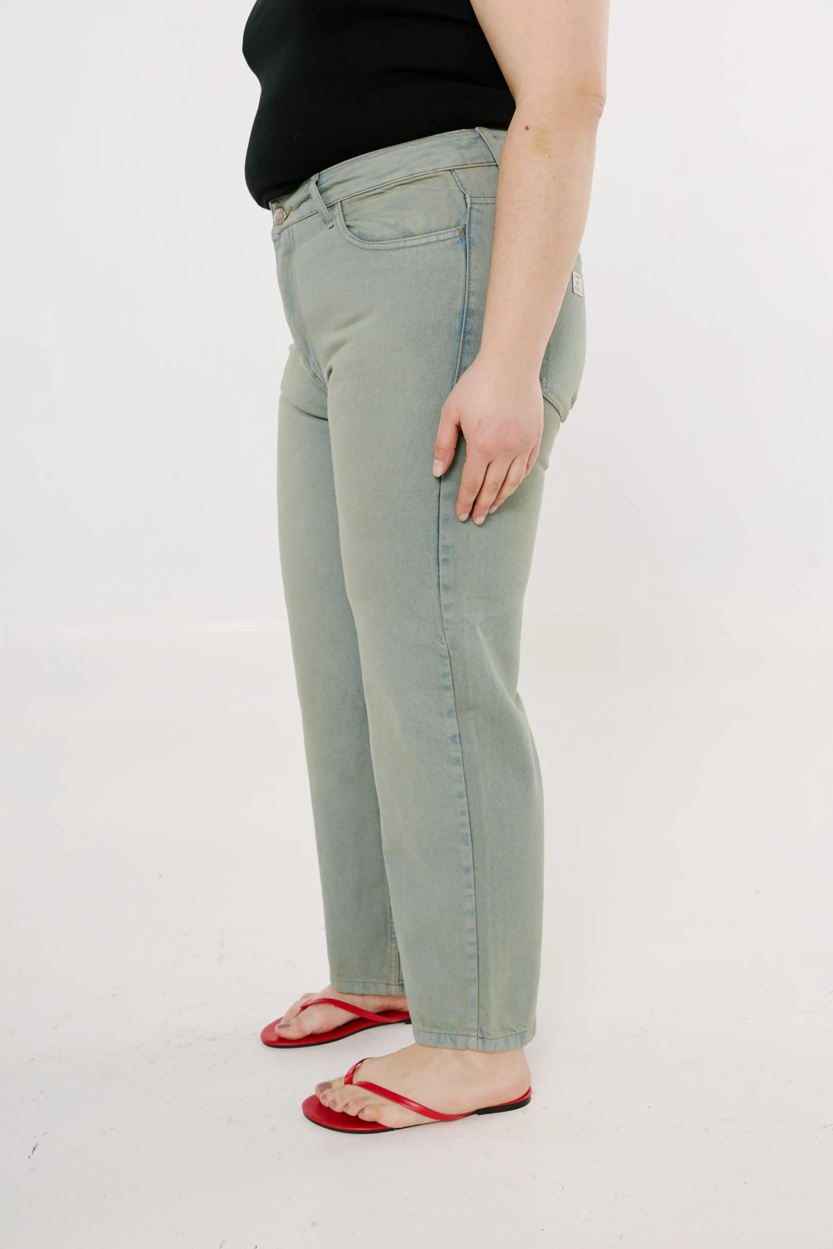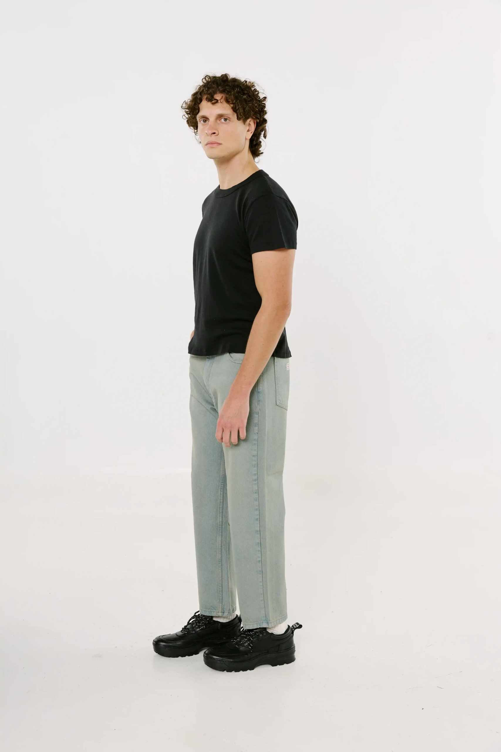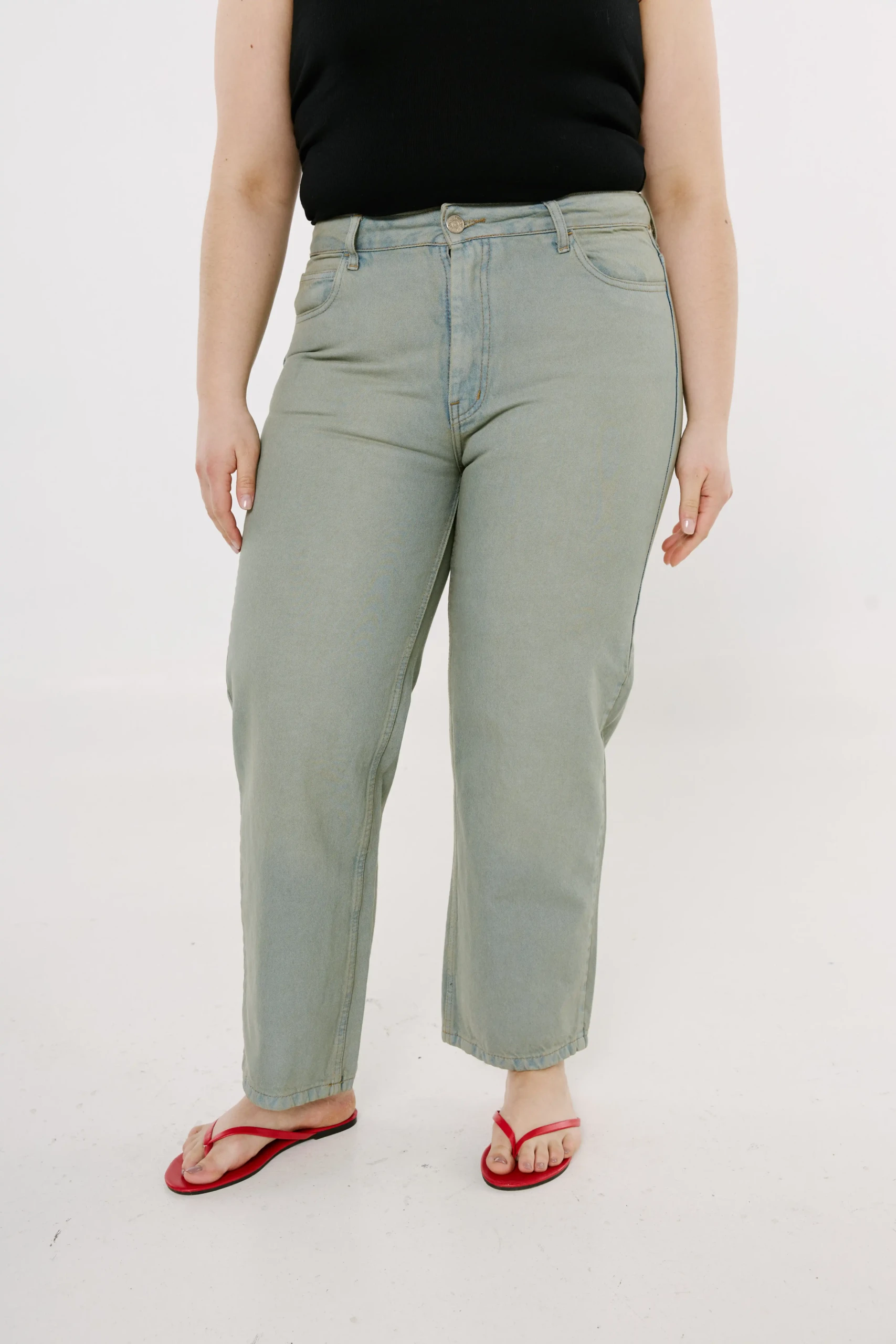 Jean confeccionado en denim azul 100% algodon con costuras cobre. Proceso de matizado para el color.