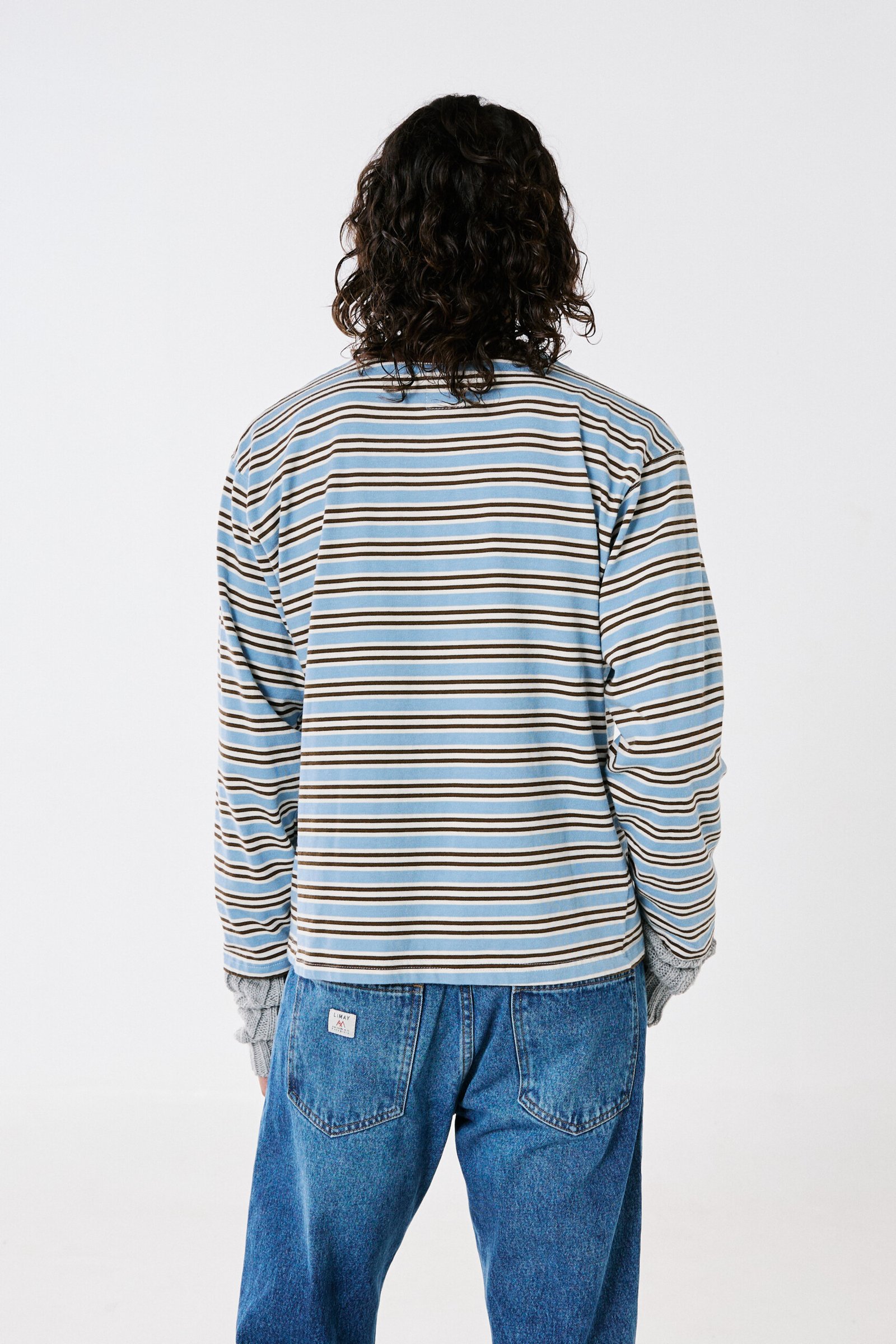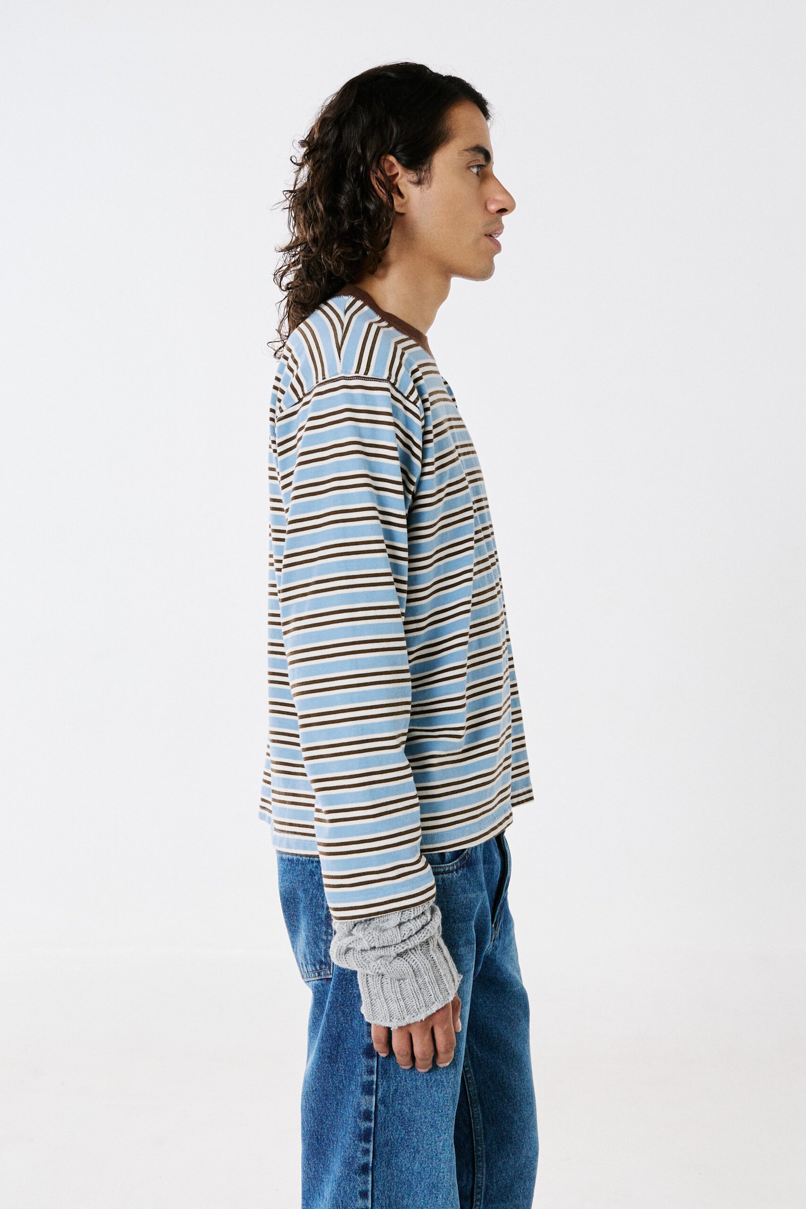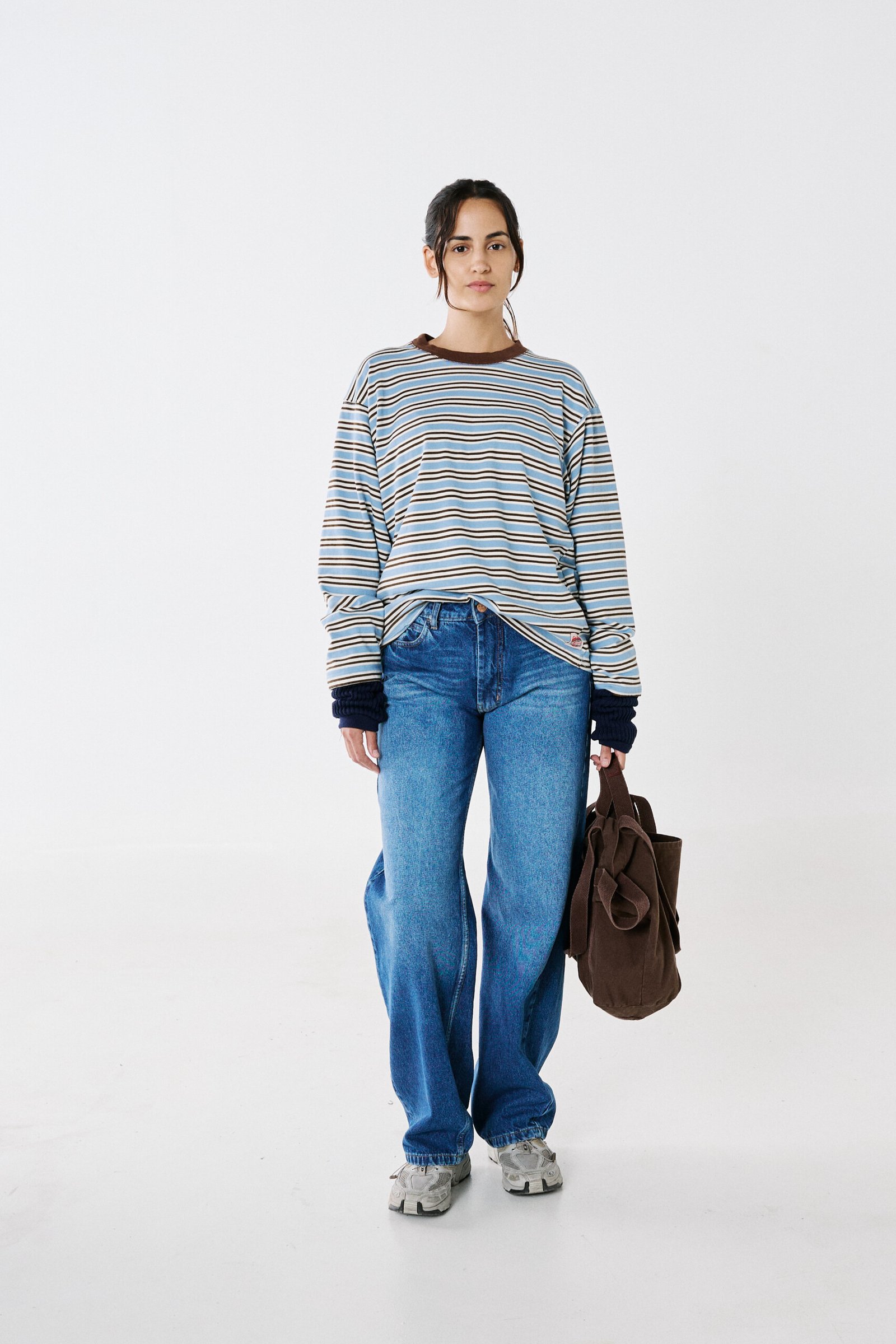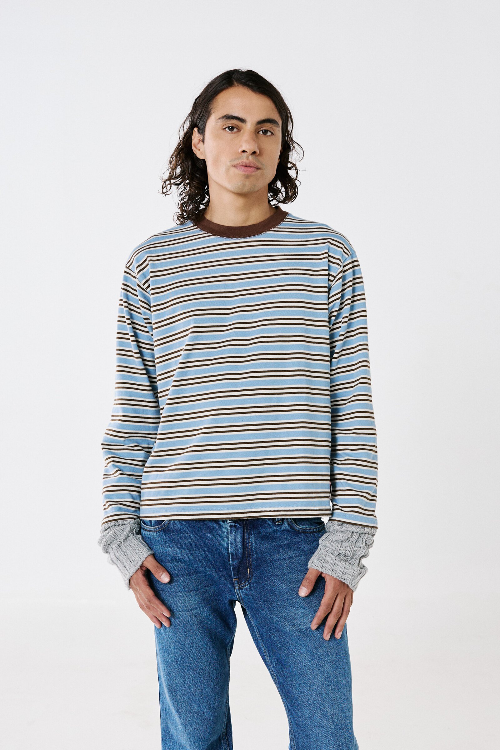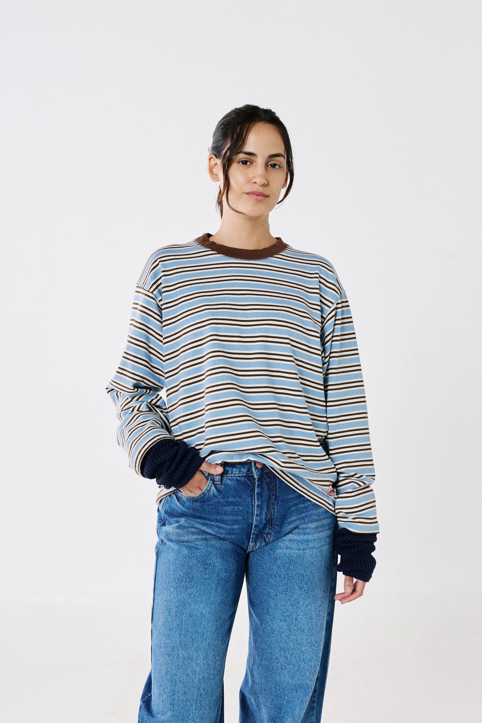 Remera escote redondo, manga larga recta. Confeccionada en jersey doble pesado de algodon rayado. Cuello en complemento chocolate con detalle de bordadora a tono. Calce over, largo a la cadera.