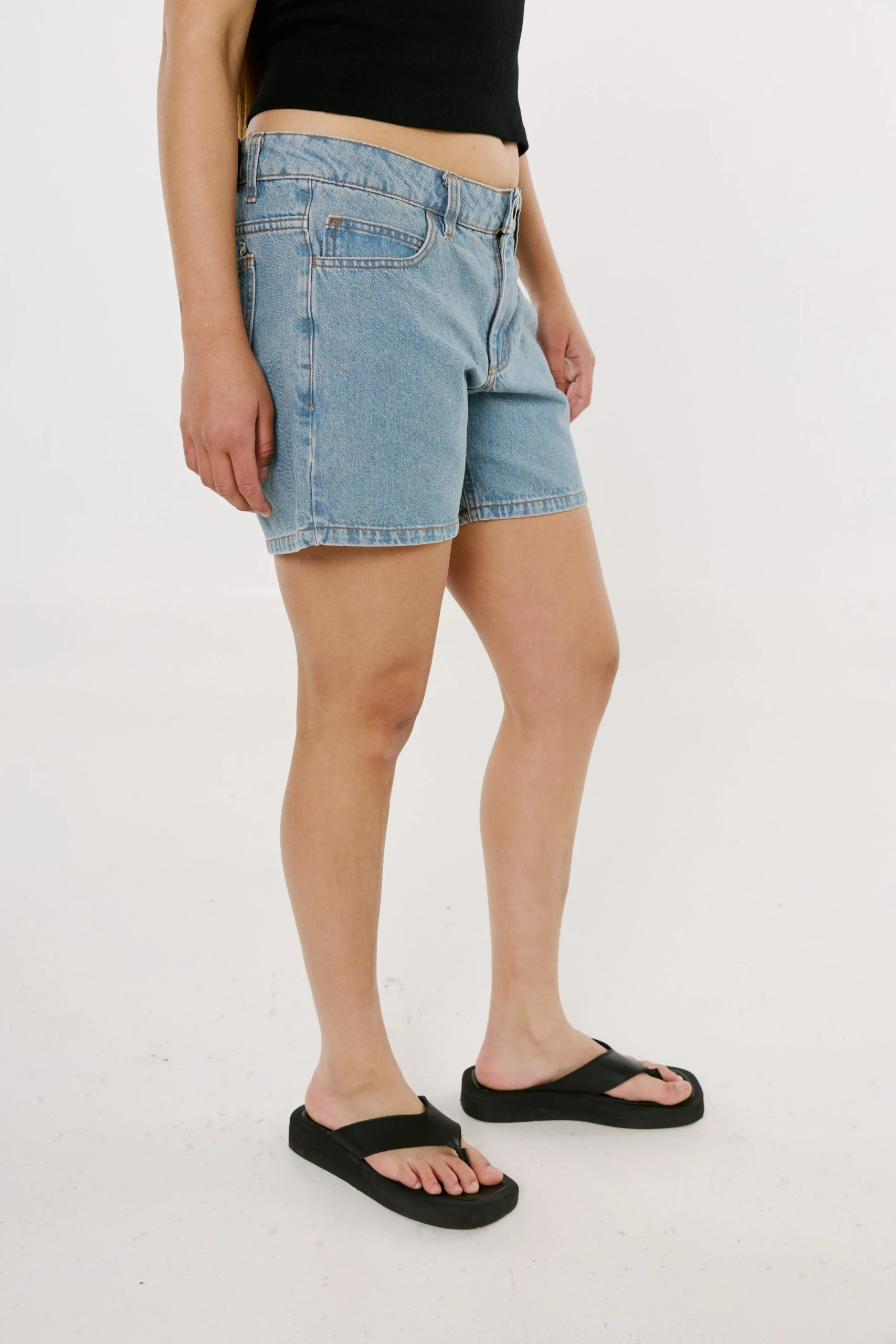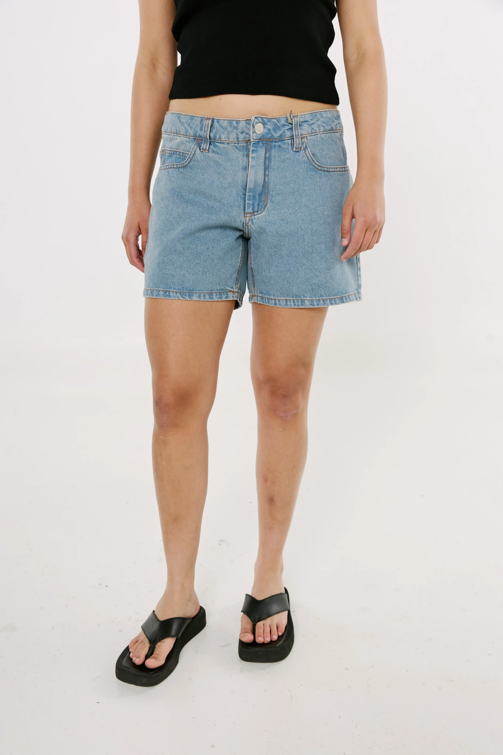 Short confeccionado en denim rígido celeste con lavado gastado y costuras cobre – 100% algodón, 11 oz –