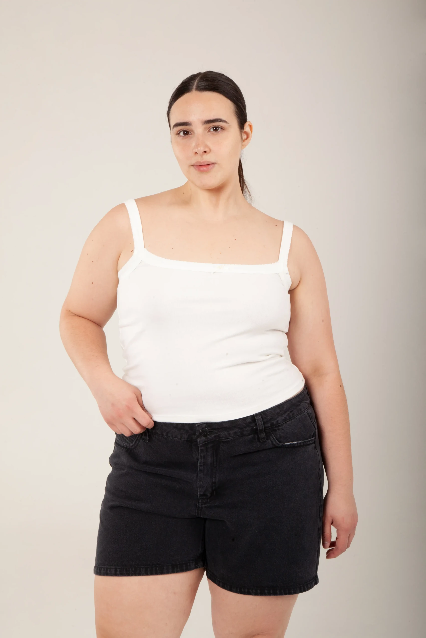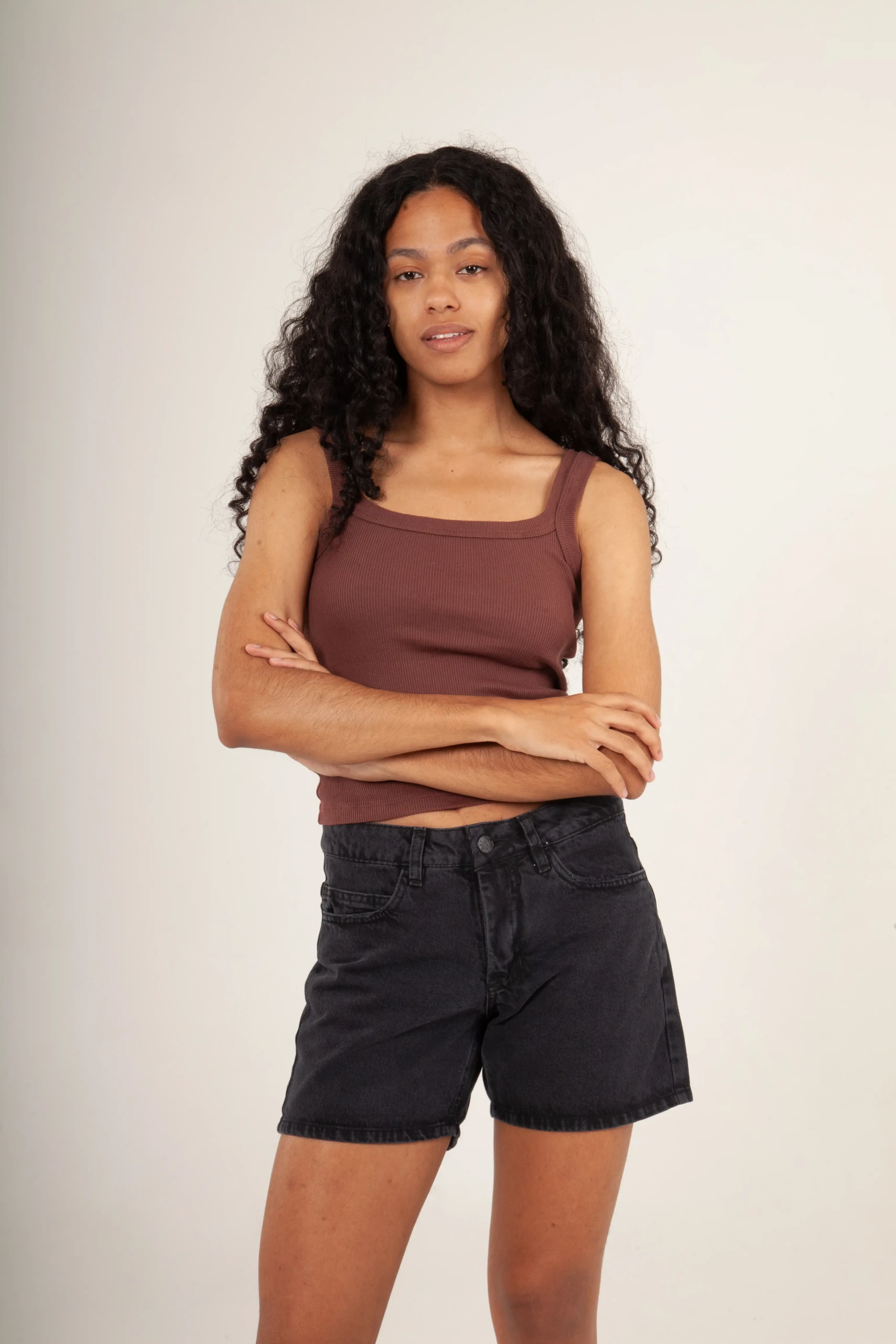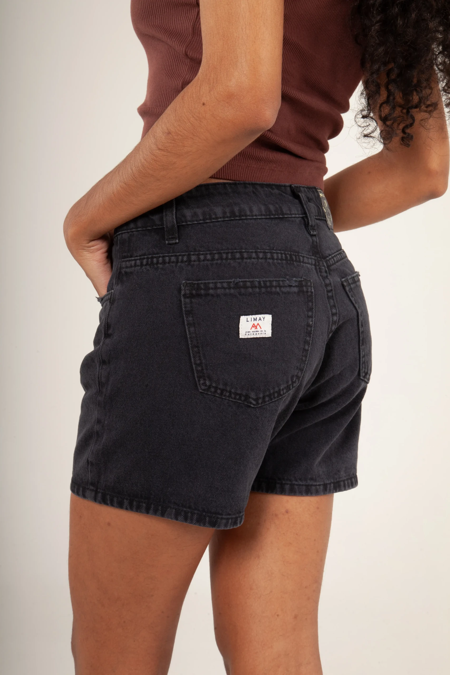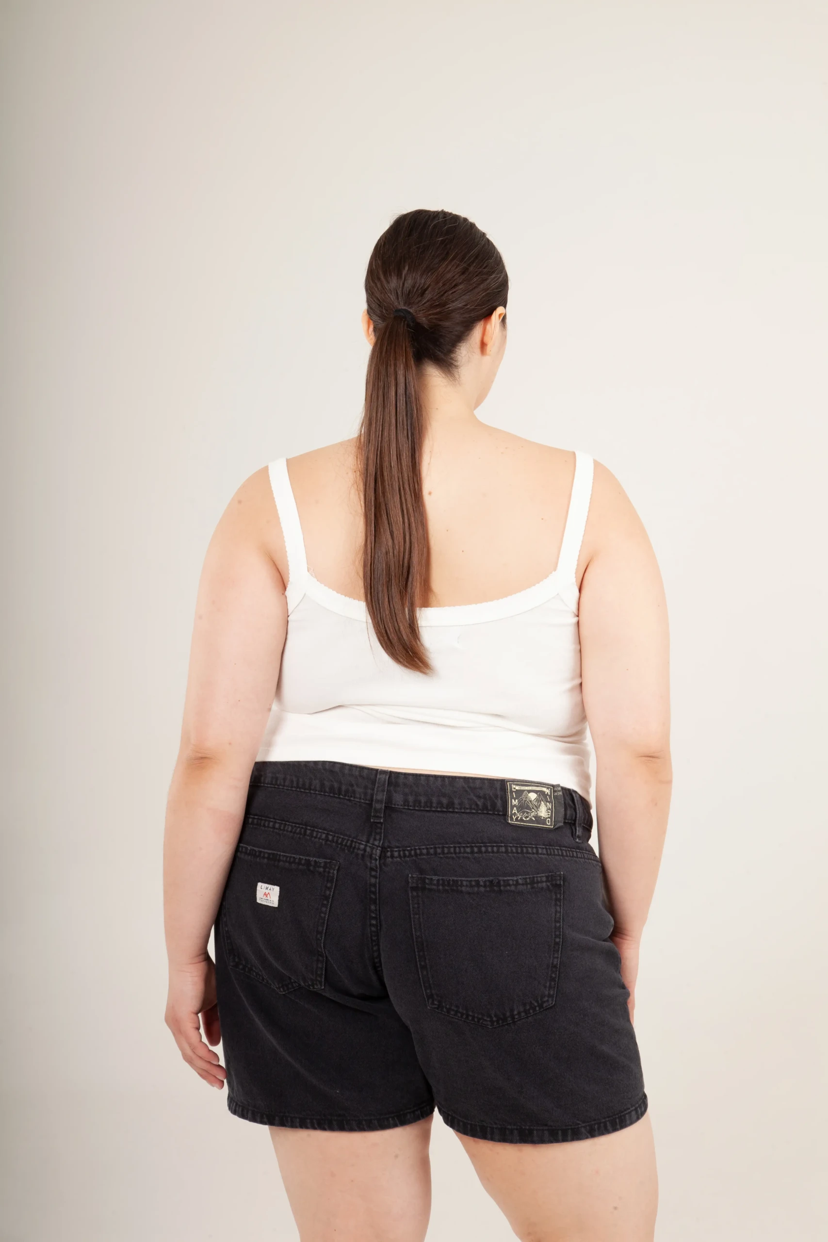 Short confeccionado en denim rígido negro con lavado gastado y costuras negras – 100% algodón, 11 oz –