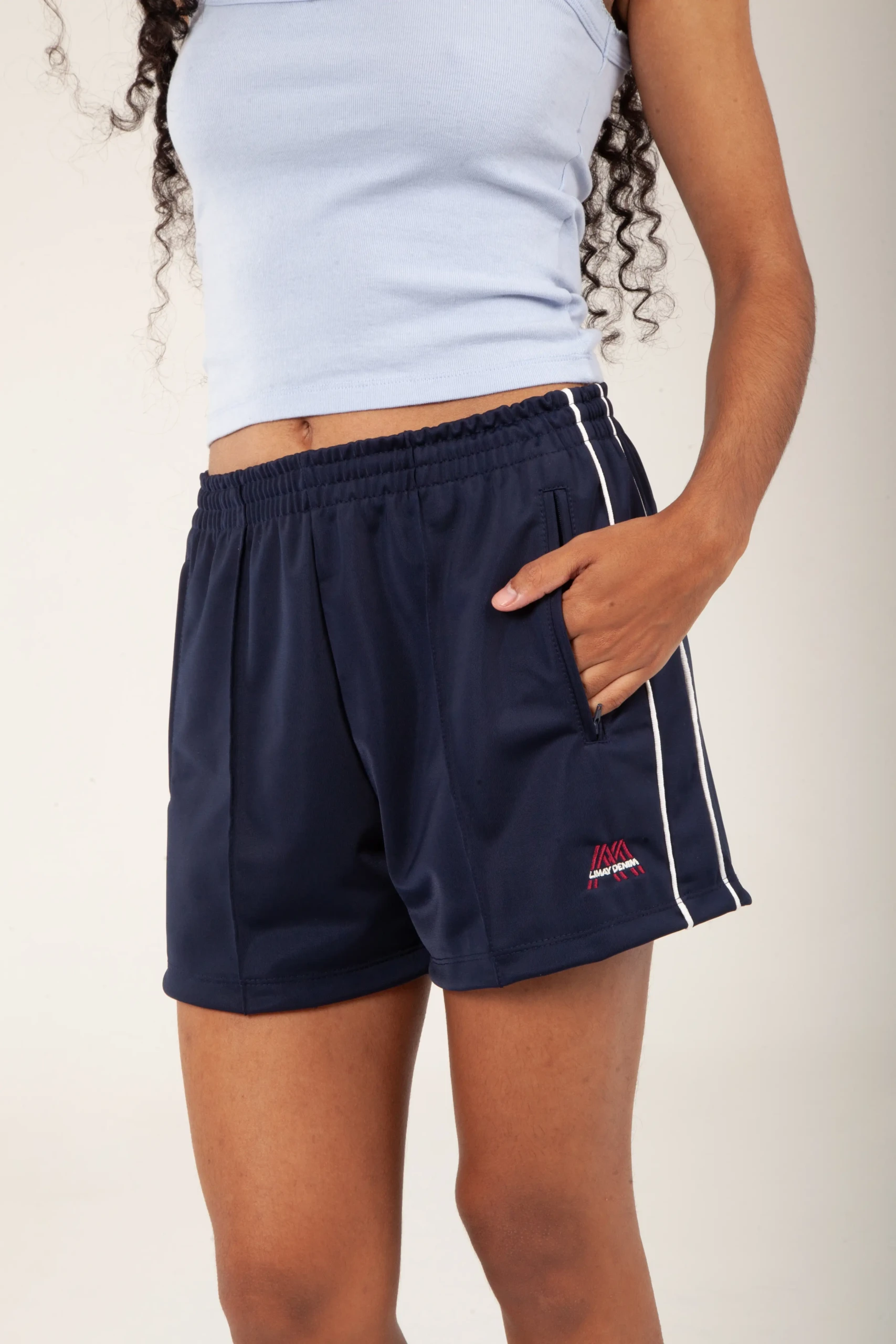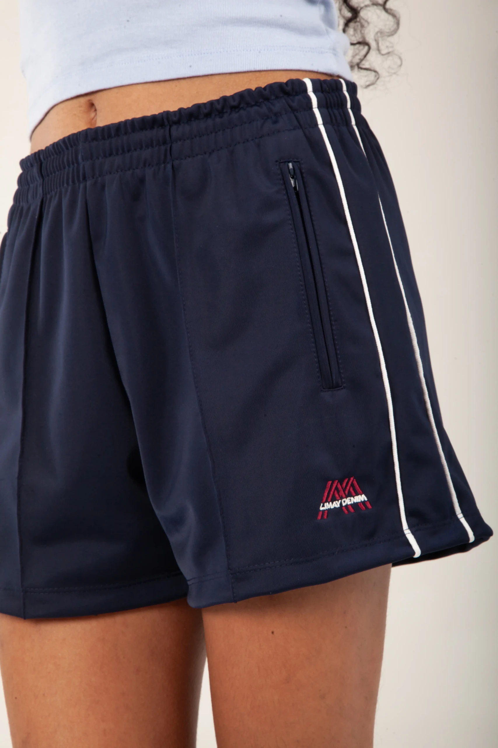 Cordon interno para mejor ajuste. Logo bordado en pierna. Bolsillos laterales con cierre y recortes en costados con vivos blancos.