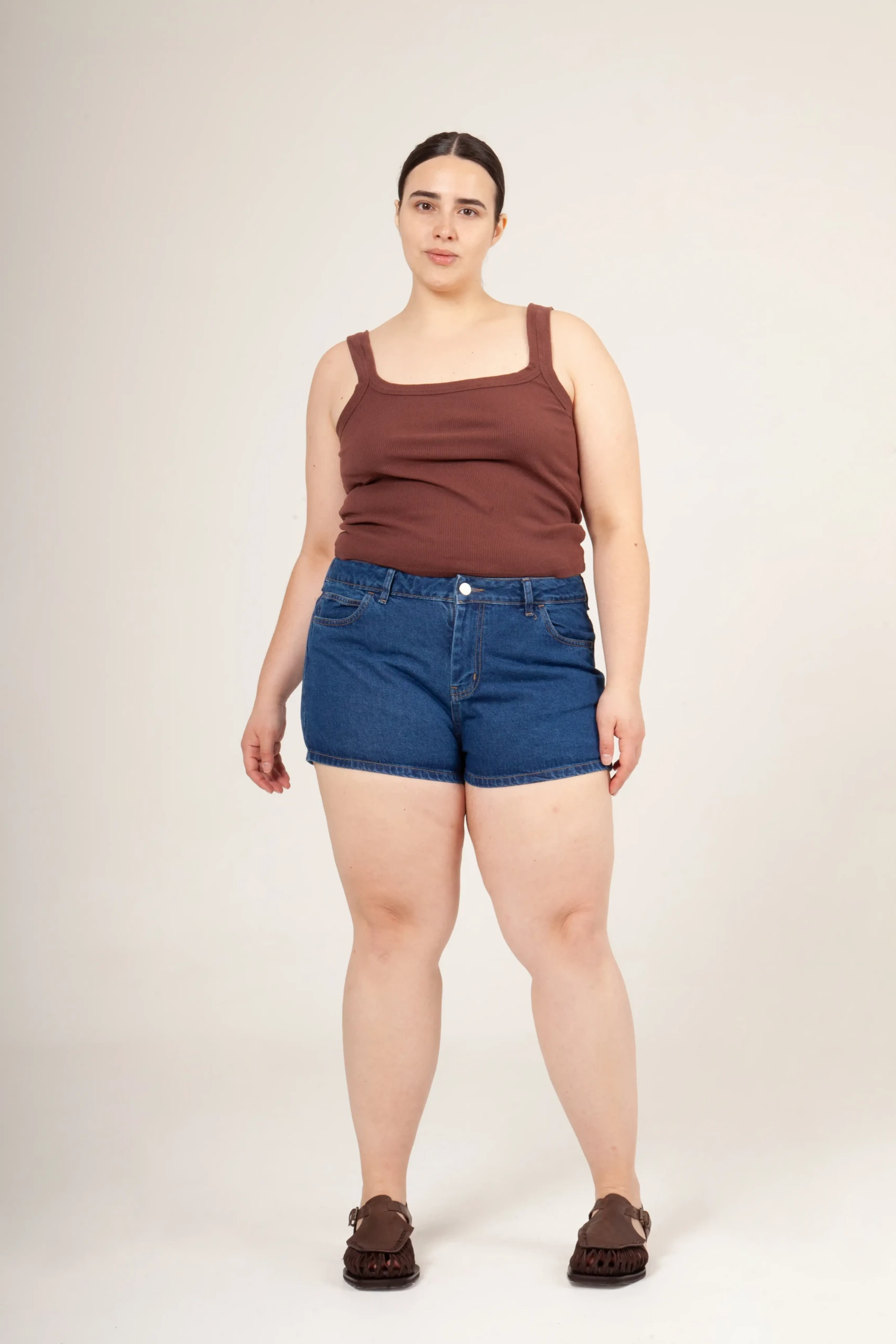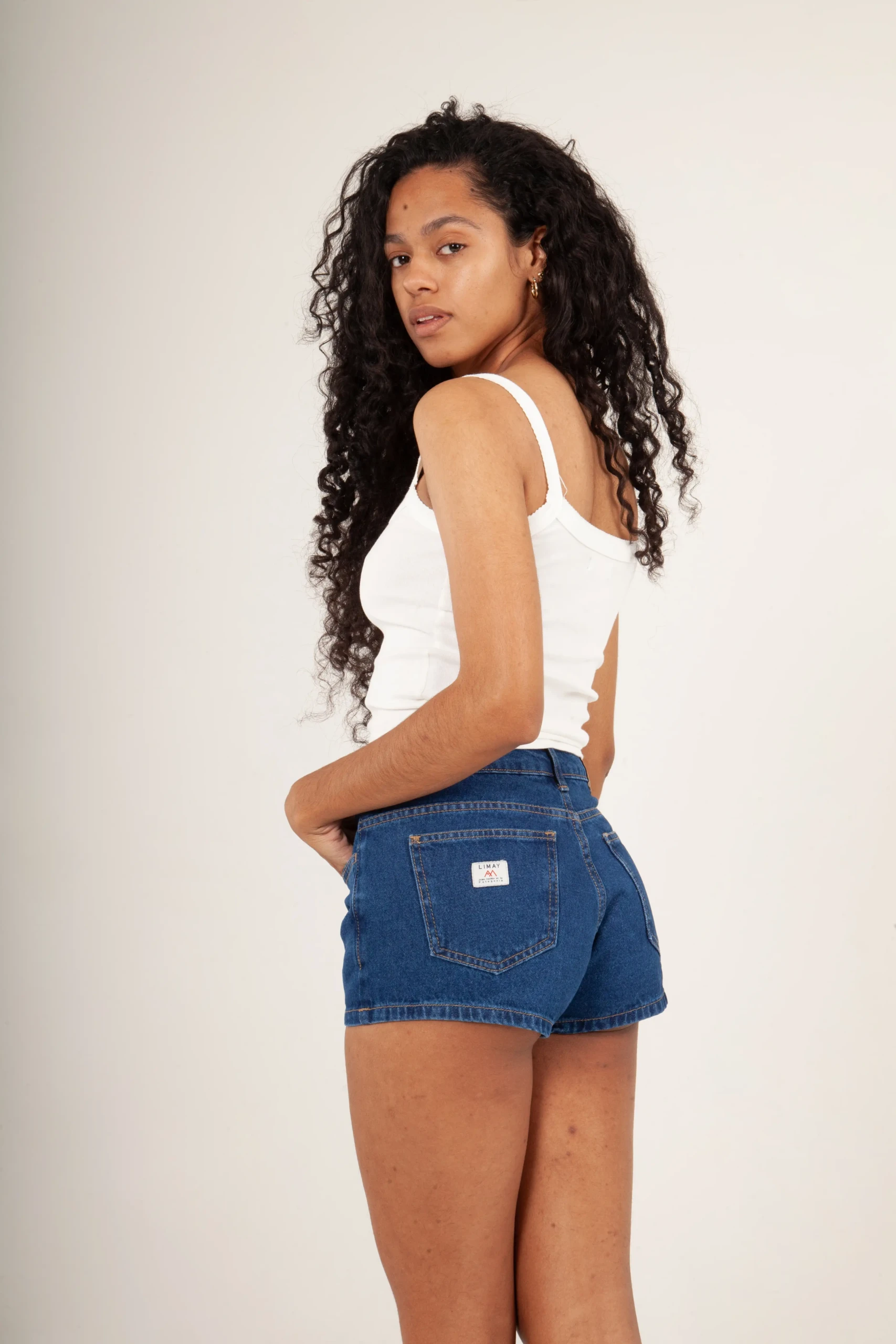 Short confeccionado en denim rígido azul y costuras cobre (100% algodón, 13 oz).