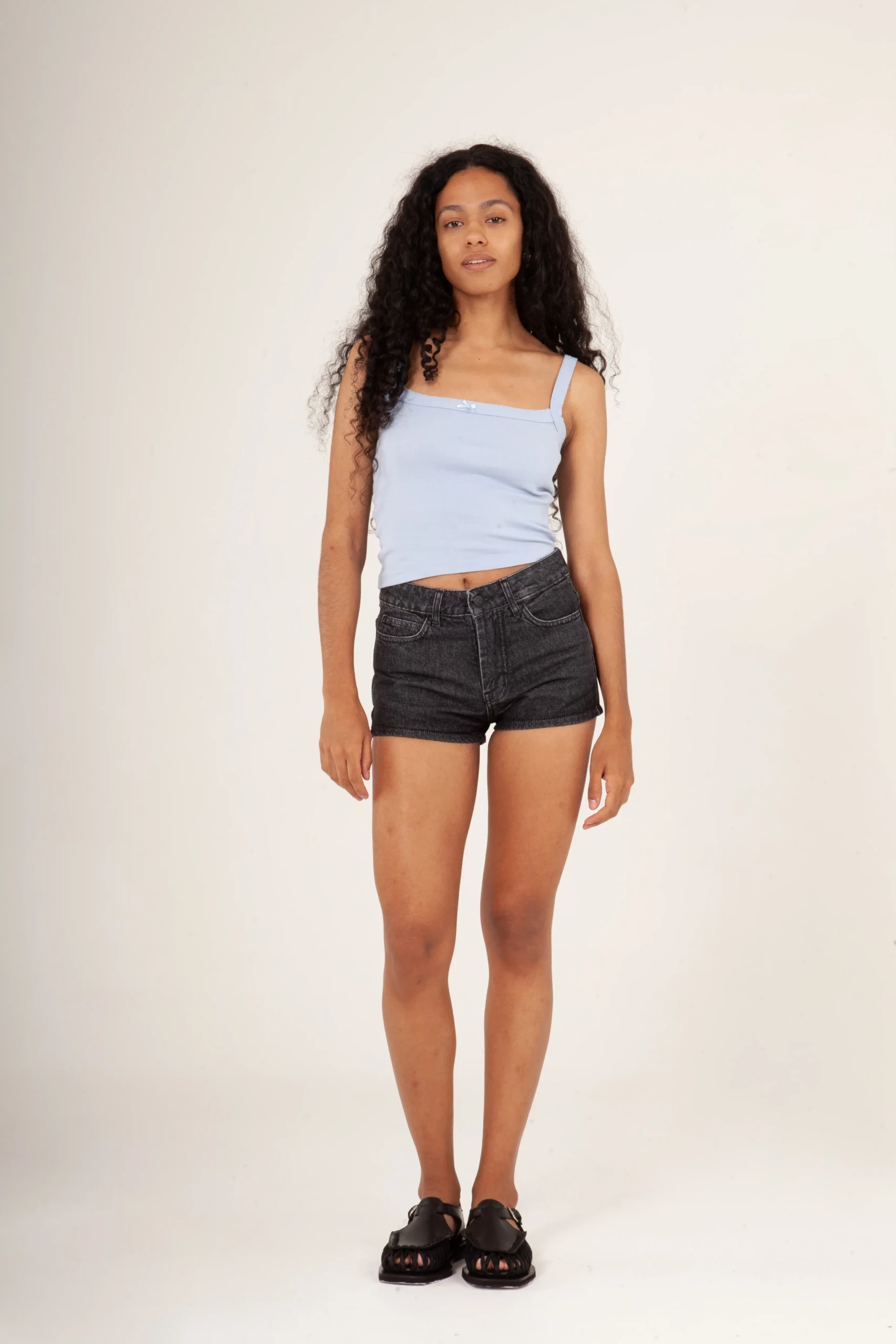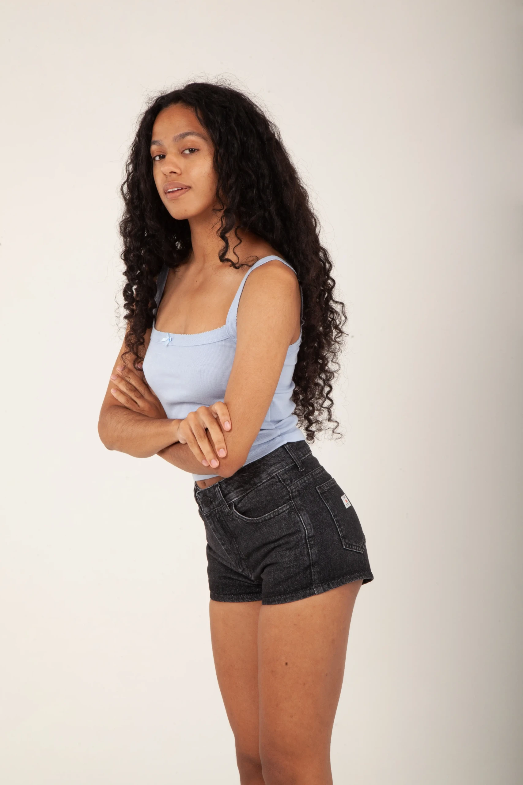Short confeccionado en denim rígido negro con lavado gastado localizado y costuras negras (100% algodón, 13 oz).
