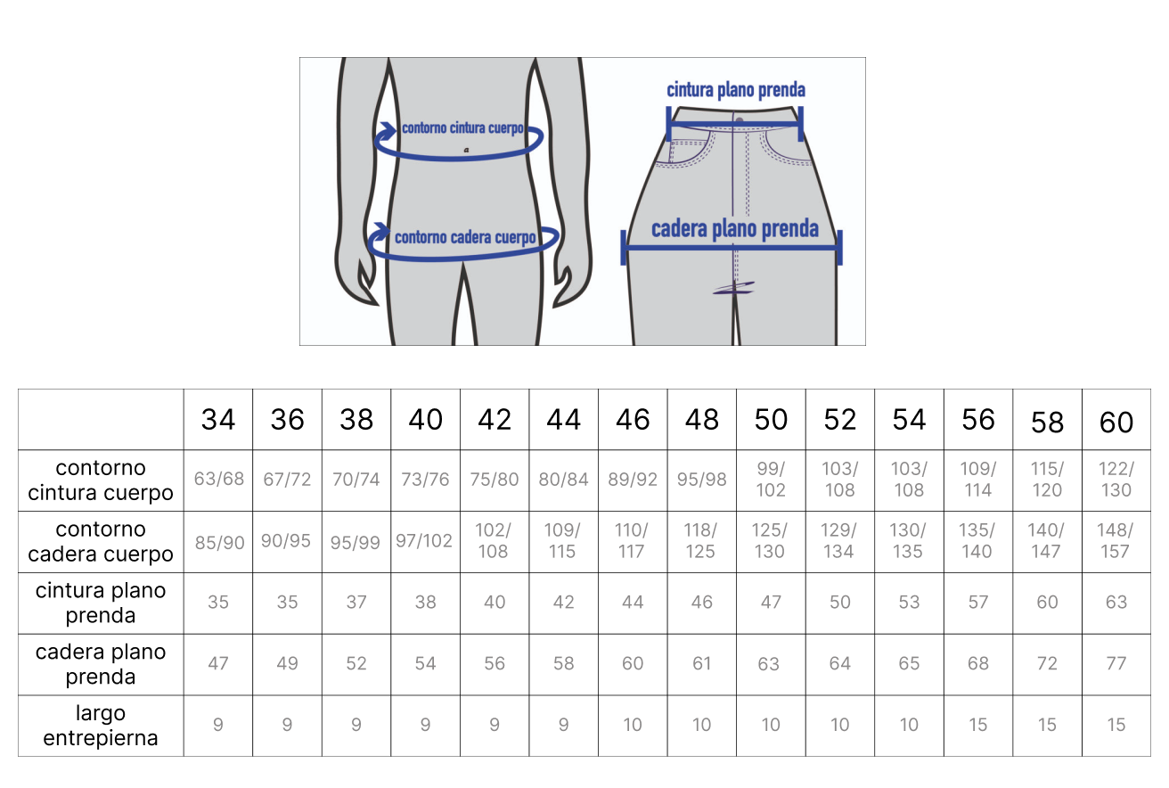Las medidas están tomadas en plano (no contorno) sobre la prenda, si vas a comparar con una prenda que tenés que sea de tela similar y que esté recién lavada así no está estirada por el uso. Si vas a comparar con tu cuerpo, la medida de cintura es a la altura del ombligo o un poquito más abajo y la cadera en la parte mas saliente de la cola, con esas dos medidas dividido 2 deberías ver qué talle de la tabla sos. La prenda estira aprox medio talle con el uso, si estás entre dos talles, para que te quede más ajustado lleva el mas chico, y para más suelto el mas grande. Si tenés movilidad reducida o estás en alguna rehabilitación física y necesitas que adaptemos esta prenda de alguna forma especial escribinos que lo hacemos.