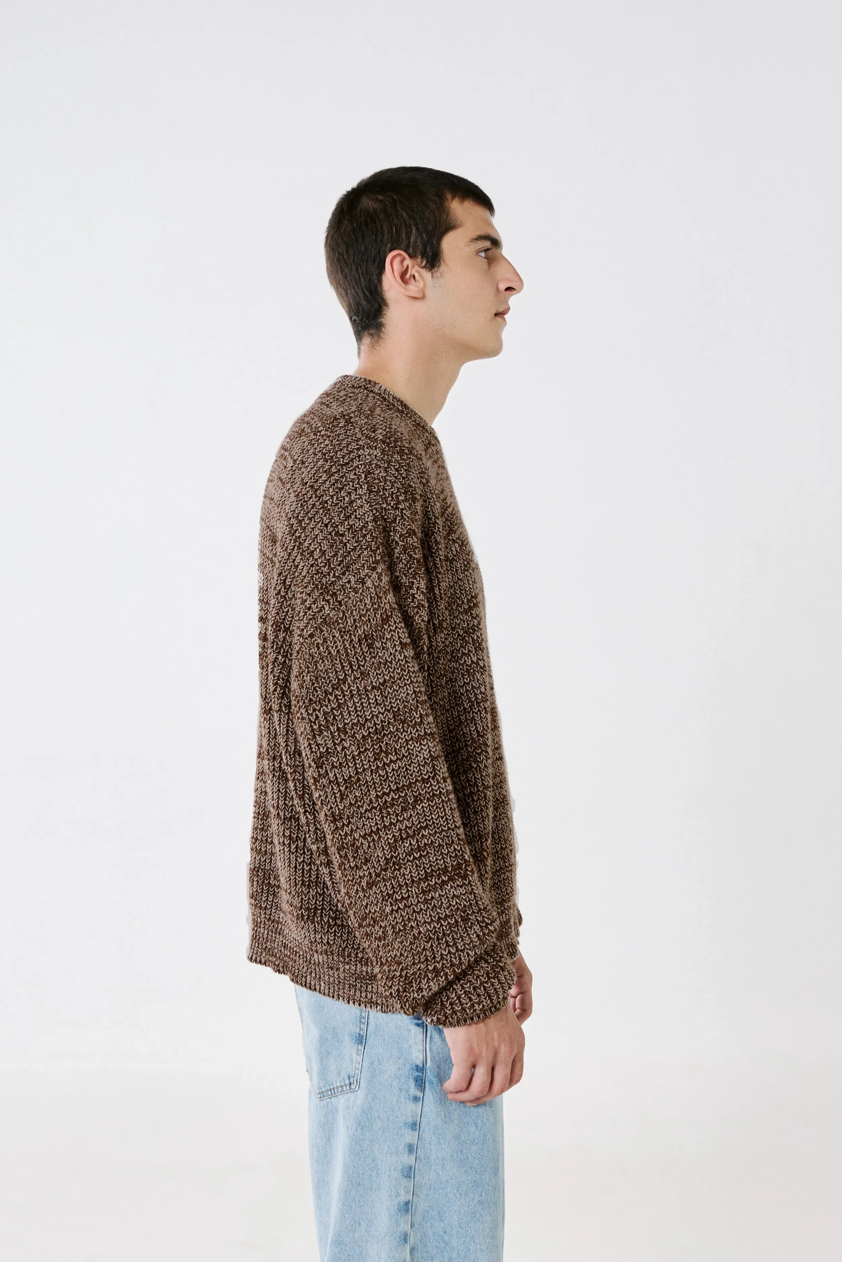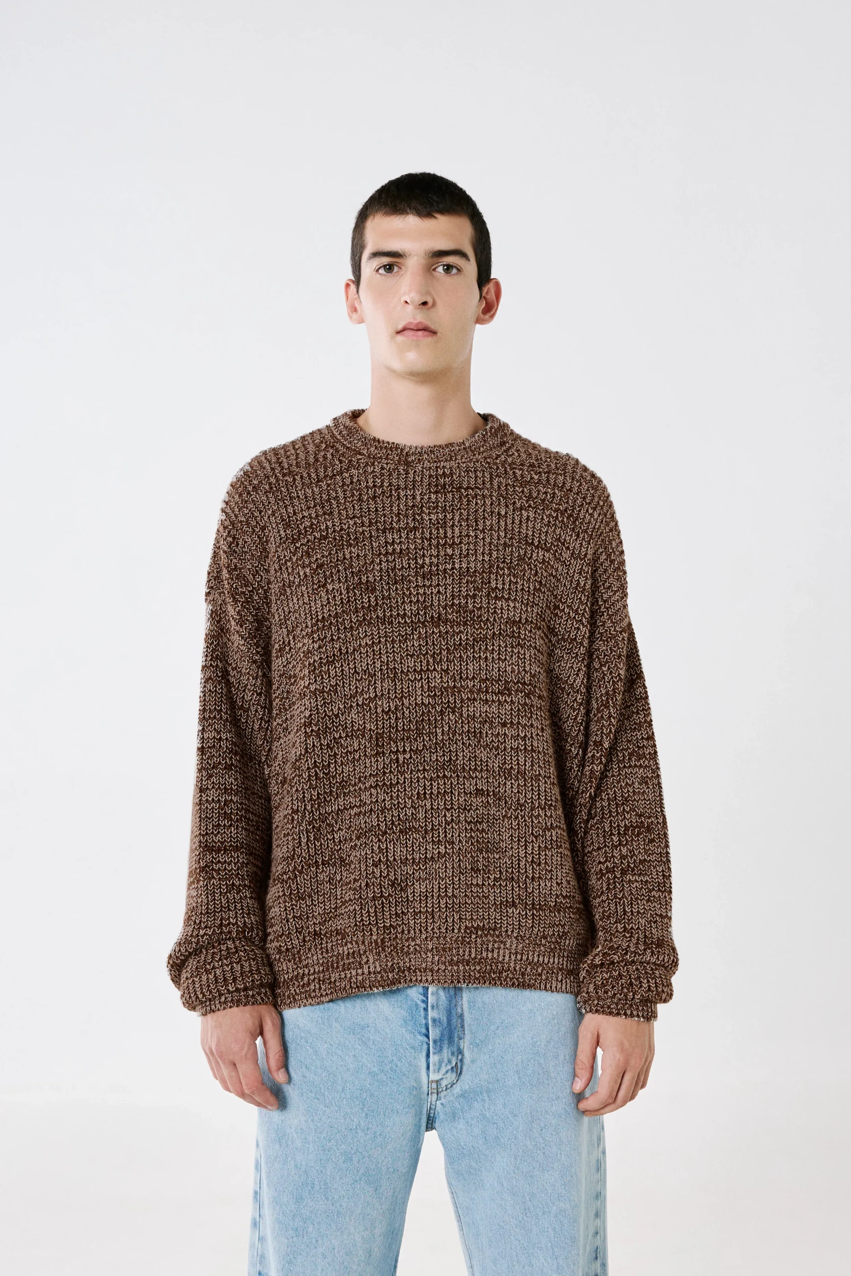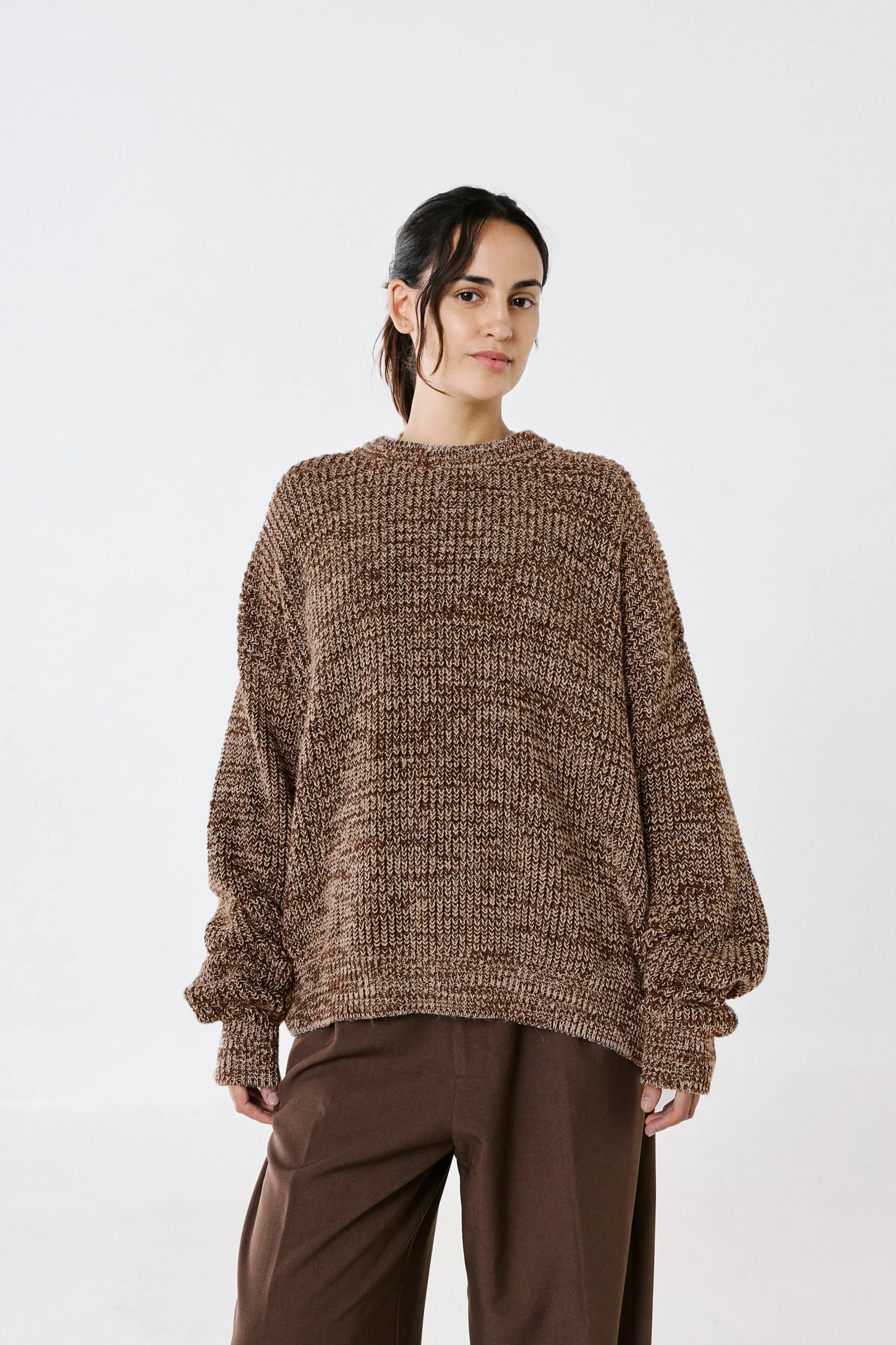 Sweater tejido matizado. Escote redondo, puño tejido elastizado en puños y cintura. Calce over, largo por debajo de la cadera. Tejido mezclando hebras de algodon chocolate y marrones con hilado frizado beige para que sea mas abrigado.
